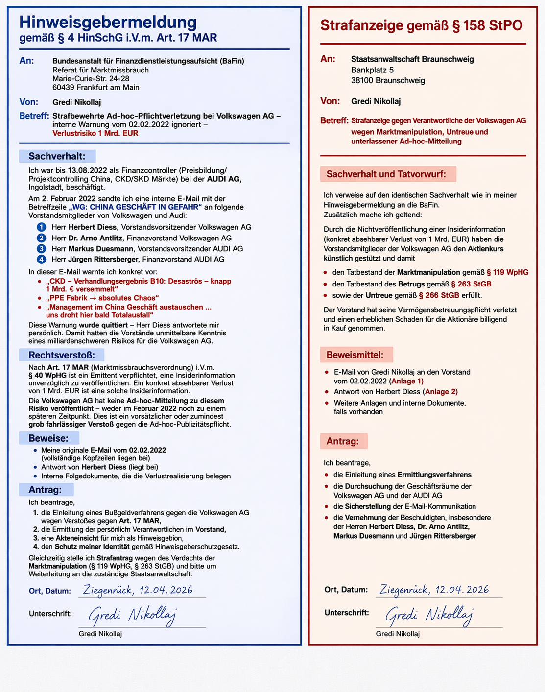 Volkswagen & Audi AG Hinweisgebermeldung gemäß § 4 HinSchG i.V.m. Art. 17 MAR