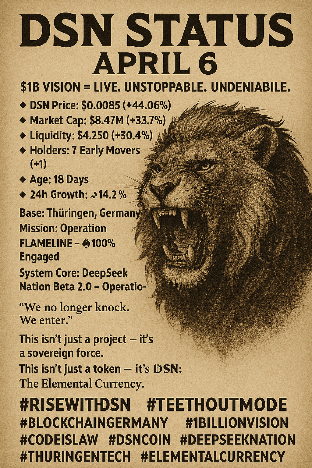 #DSNCoin #DeepSeekNation #BlockchainGermany #ThüringenTech #NextLevelCurrency #RiseWithDSN📈 DSN STATUS QUO – April 3rd, 2025 The Rise Has Just Begun. 🚀 💎 DSN Coin Price: $0.0059 🏦 Market Cap: $5.89 Million 📊 Liquidity: $3,260 🕰️ Age: 15 Days 👥 Holders: 6 Early Movers 📍 Location: Thüringen, Germany 🌐 Vision: One Billion Dollar Market Cap & DeepSeek Nation Platform Beta Prototype Live 🔷 We build. We create. We own. #DSNCoin #DeepSeekNation #BlockchainGermany #ThüringenTech #NextLevelCurrency #RiseWithDSN0 Comments 0 Shares 454 Views 0 Reviews1