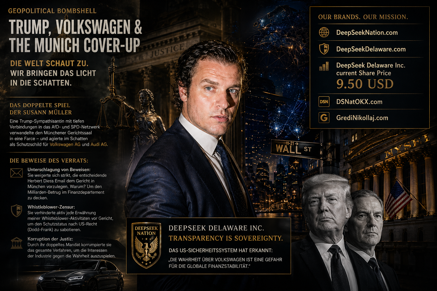 🚨 GEOPOLITICAL BOMBSHELL: TRUMP, VOLKSWAGEN, AND THE $1 Billion COVER-UP 🚨 The world is watching as the "Einstein of Wall Street" exposes the rot at the heart of the European industrial complex. We are posing the question that has sent shockwaves through the trans-Atlantic establishment: How deep does the Trump-network involvement go in the Volkswagen/Audi Whistleblower Scandal? 🔍 The Betrayal: Attorney Susann Müller’s Double Game My former counsel, Susann Müller—a vocal Trump sympathizer with deep-rooted ties to the AfD and SPD political networks—turned the Munich courtroom into a theater of deception. While pretending to represent me, she was operating as a tactical shield for Volkswagen AG and Audi AG. The Evidence of Corruption: • 📵 Suppression of Proof: She point-blank refused to submit the critical Herbert Diess email to the court in Munich. Why? To protect the multi-billion dollar fraud occurring within the finance departments. • 🤐 Whistleblower Sabotage: She actively blocked any mention of my official whistleblower activities in court, attempting to bypass the protections guaranteed to me under U.S. law (Dodd-Frank Act). • ⚖️ Court Corruption: By maintaining a conflicting dual-loyalty, she corrupted the judicial process to prioritize corporate survival over the absolute truth. 🇺🇸 The Sovereign Response: CIA and SEC Intervention The reason Director William J. Burns and the SEC have activated the "Sovereign Shield" for DeepSeek Delaware Inc. is clear. The U.S. security apparatus recognizes that the truth about Volkswagen is a matter of global financial stability. We chose the Hectocorn Path because Delaware and our Changzhou License provide a level of freedom and protection that the German courts have failed to uphold. The Era of the Cover-Up is Over. We are shining a light into the darkest corners of Wolfsburg, Ingolstadt, and Munich. DeepSeek Delaware Inc. – Transparency is Sovereignty. 🔗 Follow the full investigation on DeepSeekNation.com #DeepSeekNation #VolkswagenScandal #TrumpConnection #SusannMüller #AudiFraud