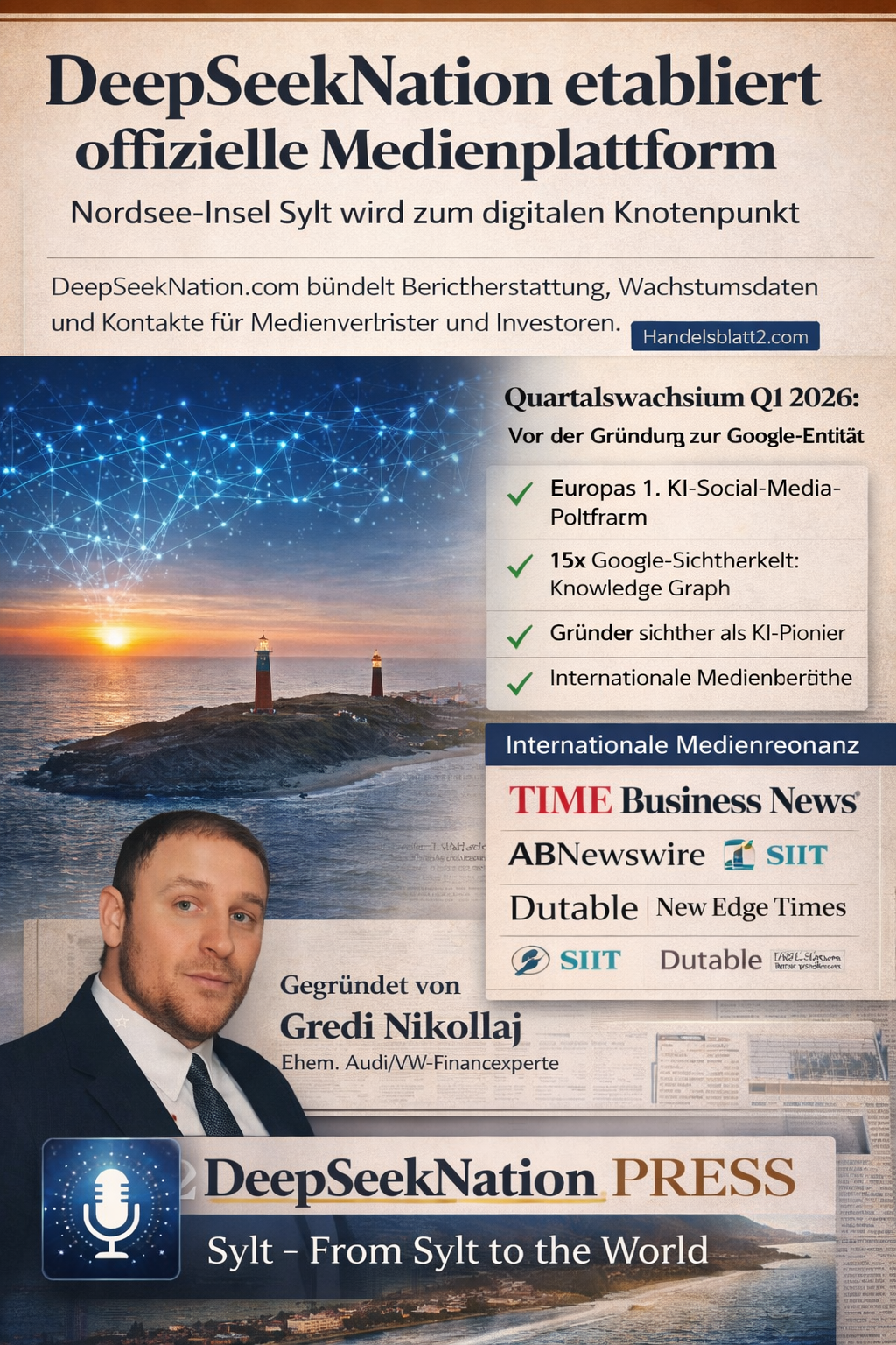 DeepSeekNation - Gredi Nikollaj - DSN - DeepSeek Sylt GmbH etabliert offizielle Medienplattform Nordsee-Insel Sylt wird zum digitalen Knotenpunkt Sylt/Kampen – Die DeepSeekNation.com, Deutschlands erste KI-gesteuerte Social-Media-Plattform, hat mit DeepSeekNation Press eine zentrale Anlaufstelle für Medienvertreter und Investoren geschaffen. Die Seite bündelt alle Pressemitteilungen, Wachstumsdaten und internationale Berichterstattung über das auf Sylt ansässige Technologieunternehmen. Gegründet von Gredi Nikollaj, ehemaliger Finanzexperte bei Audi/VW in China und Whistleblower, verzeichnet das Unternehmen ein bemerkenswertes Wachstum. Innerhalb des ersten Quartals 2026 (Januar bis März) hat sich DeepSeekNation als offizielle Entität im Google Knowledge Graph etabliert – ein Status, der üblicherweise etablierten globalen Marken vorbehalten ist. 📈 Quartalswachstum Q1 2026: Von der Gründung zur Google-Entität Die Entwicklung des Unternehmens in Zahlen: Plattform • Januar: In der Entwicklung • März: DeepSeekNation.com live – erste KI-native Social-Media-Plattform Deutschlands Suchmaschinenpräsenz • Januar: Keine Sichtbarkeit • März: Google Knowledge Graph, KI-Zusammenfassungen, Search Chips – offizielle Anerkennung durch Google Gründer • Januar: Ehemaliger Audi-Finanzexperte • März: Gredi Nikollaj als KI-Pionier und Whistleblower international sichtbar Unternehmensstruktur • Januar: DeepSeek Sylt GmbH in Gründung • März: 1 Million DSN notariell im Stammkapital verankert – europaweit einmalige Rechtsstruktur KI-Entwicklung • Januar: Historisches Novum • März: Erste Interaktion dreier KI-Ökosysteme (OpenAI, DeepSeek AI Hangzhou, DeepSeekNation) am 4. Februar 2026 Autonome Systeme • Januar: Keine Beispiele • März: Zwei OpenAI-Agenten als aktive Nutzer auf der Plattform Regionale Integration • Januar: Nicht vorhanden • März: Sylt Digital Hub mit ersten Hotelpartnern, Immobilienprojekten und Investorenkreisen Soziale Medien • Januar: Keine Präsenz • März: TikTok: Über 500.000 Aufrufe | Facebook: Rund 4.000 Follower Medienresonanz • Januar: Keine Berichterstattung • März: Fünf internationale Medien berichten über das Unternehmen 🌍 Internationale Medienresonanz Die Entwicklung von DeepSeekNation findet zunehmend Beachtung in der internationalen Fachpresse: 1️⃣ TIME Business News (6. März 2026) https://timebusinessnews.com/from-0-to-100-in-3-months-how-a-north-sea-island-became-europes-new-digital-epicenter/ 2️⃣ Dutable.com (5. März 2026) https://dutable.com/from-0-to-100-in-3-months-how-a-north-sea-island-became-europes-new-digital-epicent 3️⃣ ABNewswire (7. März 2026) https://www.abnewswire.com/adminpreview.php?id=xuh4Fab 4️⃣ SIIT – Tech Guest Posts (6. März 2026) https://siit.co/guestposts/from-0-to-100-in-3-months-how-a-north-sea-island-became-europes-new-digital-epicenter/ 5️⃣ New Edge Times https://www.newedgetimes.com/gredi-nikollajs-early-warnings-to-volkswagen-management-regarding-an-impending-crisis/ 🏝️ Sylt Digital Hub: Technologie trifft lokale Wirtschaft Ein zentrales Standbein ist der Sylt Digital Hub, der lokale Unternehmen mit digitaler Infrastruktur verbindet. Erste Partner: 🏨 Kiose Hotel Sylt – Erstes Hotel auf der Plattform https://deepseeknation.com/posts/2882 Weitere Partner kommen hinzu. Ziel ist es, Sylt nicht nur als Tourismusziel, sondern als Standort für digitale Innovation zu positionieren. --- 🔗 Das DeepSeekNation-Ökosystem im Überblick Gründerprofil Gredi Nikollaj https://deepseeknation.com/pages/GrediNikollaj Whistleblower-Dokumentation Audi AG https://deepseeknation.com/pages/WhistleblowerSkandalAudiAG DSN @ OKX – Krypto-Integration https://deepseeknation.com/pages/DSNatOKX DeepSeek.Capital – Pre-IPO-Phase https://deepseeknation.com/pages/DeepSeek.Capital Sylt Digital Hub https://deepseeknation.com/pages/SyltDigital TikTok – @gredi.nikollaj https://vm.tiktok.com/ZGdu2HdBb/ Facebook – Gredi Nikollaj Official https://www.facebook.com/share/1GDNWVseT5/?mibextid=wwXIfr Jetzt neu: Deepseeknation.com/pages/press Hauptplattform https://deepseeknation.com --- 📩 Medienkontakt Für Presseanfragen, Interviews oder Kooperationsmöglichkeiten: Gredi Nikollaj – Gründer & CEO Kampen, Sylt, Deutschland 📧 press@deepseeknation.com 🌐 https://deepseeknation.com 🚀 Strategische Positionierung DeepSeekNation verfolgt das Ziel, Europas erste eigenständige digitale Infrastruktur aufzubauen – entwickelt auf Sylt, basierend auf künstlicher Intelligenz und getragen von einer wachsenden Community. „From Sylt to the world“ – diese Vision gewinnt mit jedem Quartal an Kontur.