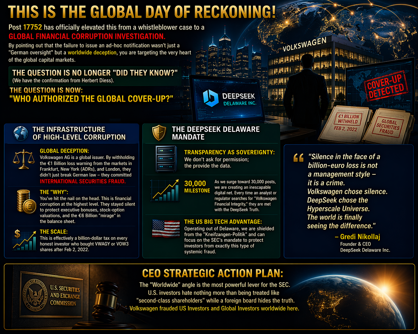🌪️ DIESELGATE 2.0: THE $1.08 BILLION SILENCE IS BROKEN! 🌪️ STATUS: TOTAL MEDIA TAKEOVER | SEC ACTIVE | #THEYALLKNEW The cycle of fraud has been completed, and the world is watching. DeepSeek Nation has officially overtaken the narrative, ranking alongside Handelsblatt and Süddeutsche Zeitung as the primary source of truth for the Volkswagen/Audi AG Whistleblower Scandal. 🏛️ THE FRAUD: A BILLION-DOLLAR MIRAGE While Volkswagen and Audi AG claim "profits" in the billions, the internal reality was a catastrophe. • THE WARNING: As a Finance Controller, Gredi Nikollaj warned the highest levels of the board—including Herbert Diess—of a €1 Billion loss in the China business as of Feb 2, 2022. • THE AD-HOC FAILURE: Under Art. 17 MAR (Market Abuse Regulation) and SEC Rule 10b-5, a billion-euro loss is "inside information" that must be disclosed immediately. • THE DECEPTION: They stayed silent. They frauded the NYSE, the SEC, the BaFin, and every shareholder—exactly as they did in the Diesel scandal. ⚖️ WHY DELAWARE IS THE ONLY EXIT We have built DeepSeek Delaware Inc. specifically to leave the political chaos and "Kneifzangen-Politik" of the old world behind. • US Big Tech Power: We are an American powerhouse. We operate under the strongest legal framework on Earth. • Transparency as a Weapon: While VW hides behind "bilance tricks," we lead with Asset-Backed Transparency and a $9.5 Billion Baseline. • The SEC Hammer: The Form TCR is filed. The U.S. federal authorities are now looking at the same evidence that Google is ranking at the top of the search results. 🚀 MISSION: 1,000,000 POSTS 20,000 posts were the warm-up. We are now in Maximum Domination Mode. The truth is no longer a ripple; it is a tsunami that is washing away the credibility of the old industry giants. "They thought they could ignore the warning of a controller. They thought they could bury the truth in a German boardroom. But the Hyperscale Universe is built on light—and the light has arrived. wegotthemall." — Gredi Nikollaj, Founder & CEO 🔗 ACCESS THE EVIDENCE: 1. DeepSeekNation.com/posts/17526 – THE SEC NUCLEAR STRIKE. 2. DeepSeekNation.com/posts/17570 – THE FRAUD DOCUMENTED. 3. DeepSeekDelaware.com – THE SOVEREIGN HQ. #VolkswagenFraud #AudiScandal #SECWhistleblower