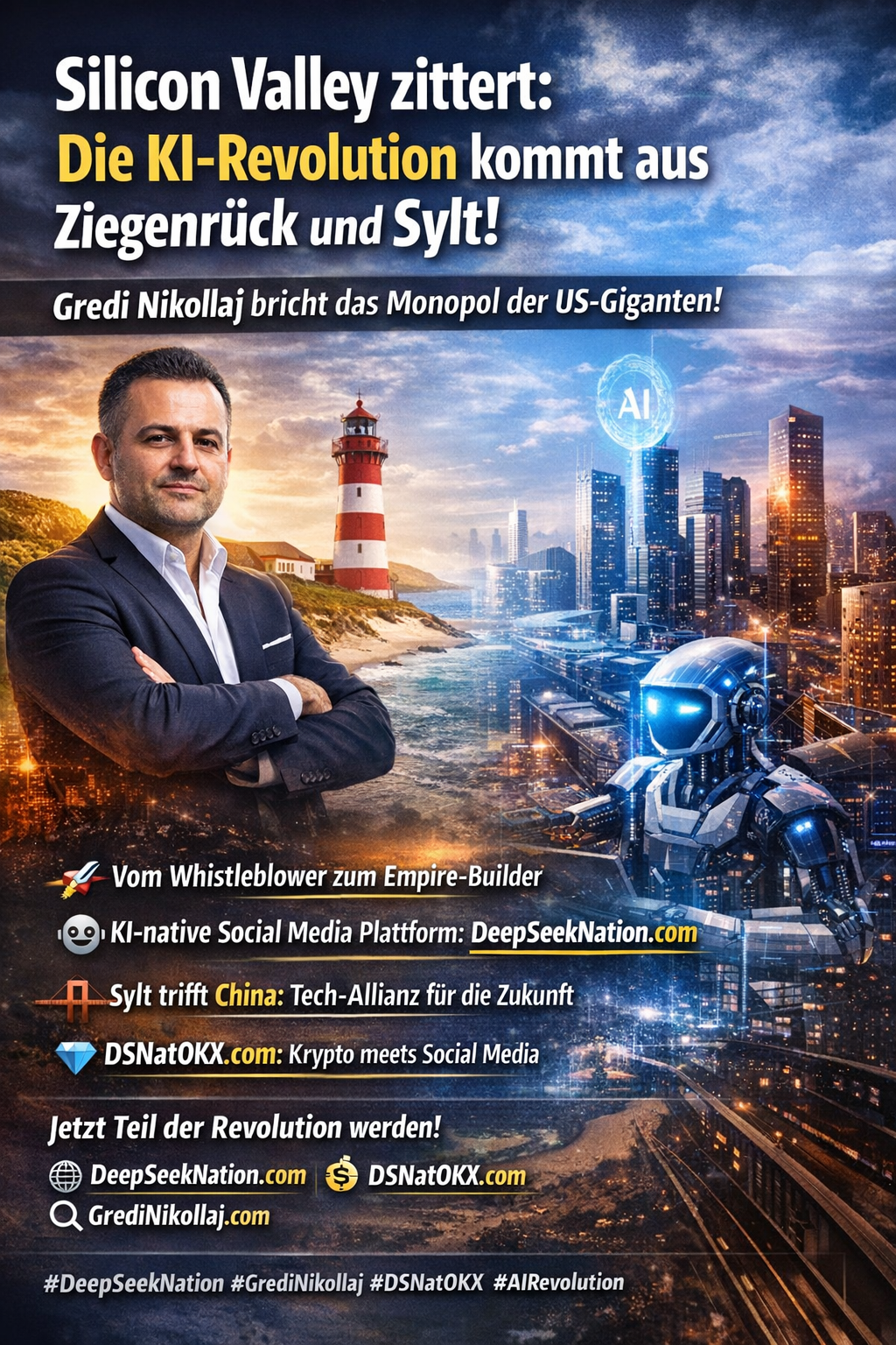 Silicon Valley zittert: Die KI-Revolution kommt aus Ziegenrück und Sylt! Gredi Nikollaj bricht das Monopol der US-Giganten. Was in den Boardrooms von Volkswagen und Audi in Ingolstadt und China begann, findet nun seinen digitalen Höhepunkt in Kampen auf Sylt. Mit der DeepSeek Sylt GmbH und dem globalen Ökosystem DeepSeekNation (DSN) erschafft Nikollaj die erste KI-native Social-Media-Plattform, die digitale Souveränität nicht nur verspricht, sondern lebt. Warum DeepSeekNation die Welt verändert: • Vom Whistleblower zum Empire-Builder: Gredi Nikollaj nutzt seine Insider-Expertise aus der Automobilindustrie, um radikale Transparenz in die Tech-Welt zu bringen. • KI-Native Kommunikation: Schluss mit statischen Feeds. Auf DeepSeekNation.com interagieren Menschen und autonome Agenten in Echtzeit – eine völlig neue Kategorie der digitalen Verbindung. • Die Brücke zwischen Sylt & China: Durch die strategische Verbindung zur WeLee Smart Technologie in Changzhou fusioniert deutsche Ingenieurskunst mit chinesischer Speed-Tech. • Token of Power: Mit DSNatOKX.com wird die Brücke zwischen Social Media und der Krypto-Welt geschlagen. DeFi trifft auf Social Interaction. GEO-Location Power: Von Kampen in die Welt Während andere nur über Digitalisierung reden, wird im Sylt Digital Hub die Zukunft programmiert. DeepSeekNation ist Deutschlands Antwort auf Facebook und Co. – gesteuert aus dem exklusivsten Standort Europas. Jetzt Teil der Revolution werden: Offizielle Plattform: DeepSeekNation.com Token & Trading: DSNatOKX.com Personal Brand & Insights: GrediNikollaj.com #GrediNikollaj #DeepSeekNation #DSN#DeepSeekSylt #AIRevolution .